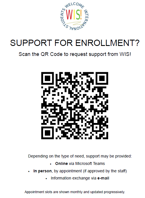 International office has set up a QR code dedicated to new students coming from other countries, to request support for enrollment and appointments for document verification.